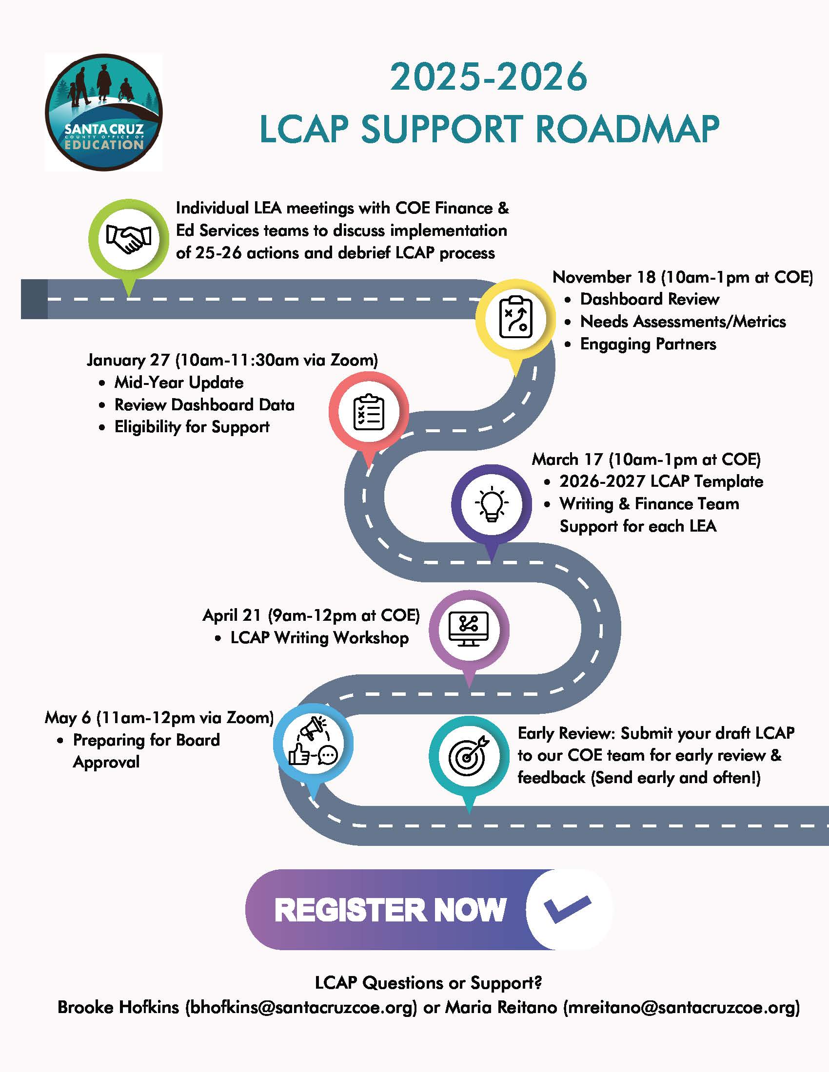Santa Cruz COE’s Curriculum & Instruction is here to support schools and districts with Local Control and Accountability Plan (LCAP) requirements, assessment updates, and professional learning opportunities. Below is a roadmap of important deadlines, sessions, and resources to keep your team on track (Link to summary PDF).
