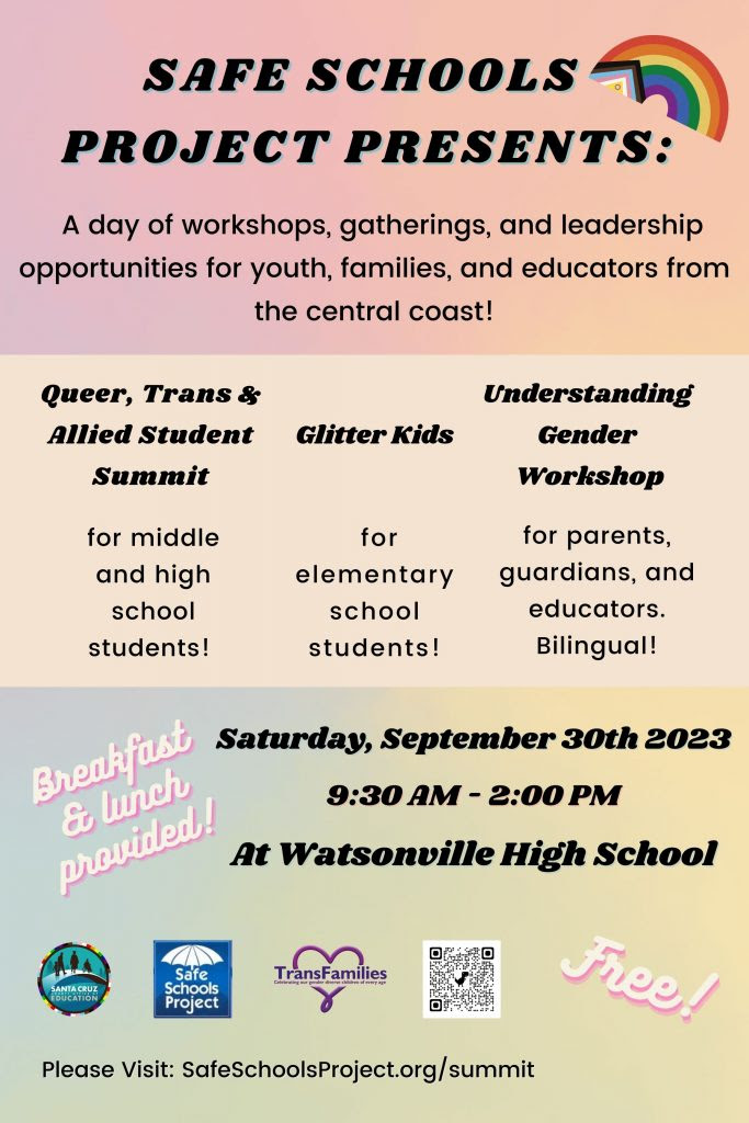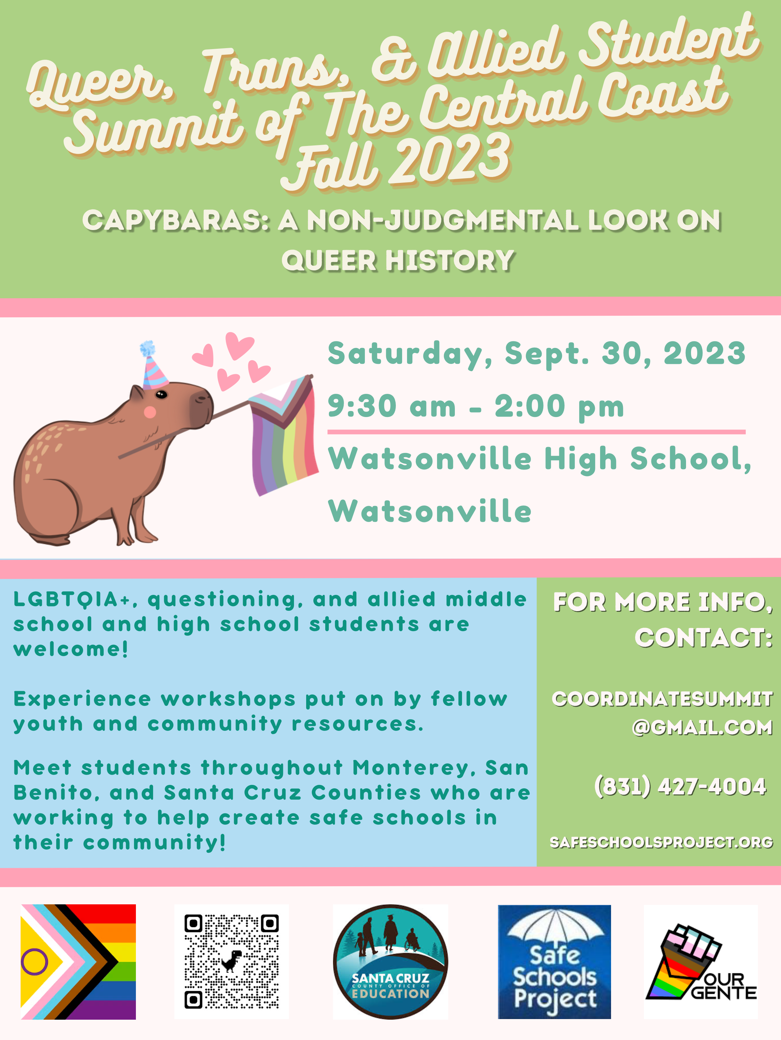 The Queer, Trans, and Allied Student Summit of the Central Coast is a free summit that is led by youth leaders from the tri-county area. This upcoming summit will provide students the opportunity to: