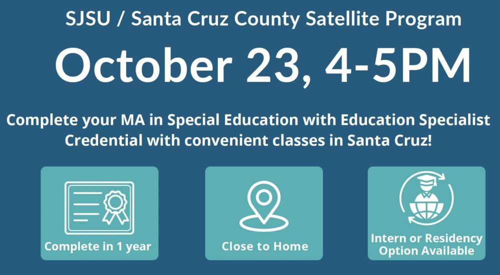 The Santa Cruz County Office of Education (Santa Cruz COE) and San José State University (SJSU) are excited to announce a new Satellite Program offering a Preliminary Education Specialist Teaching Credential with an option to add a Master of Arts in Special Education—right here in Santa Cruz!