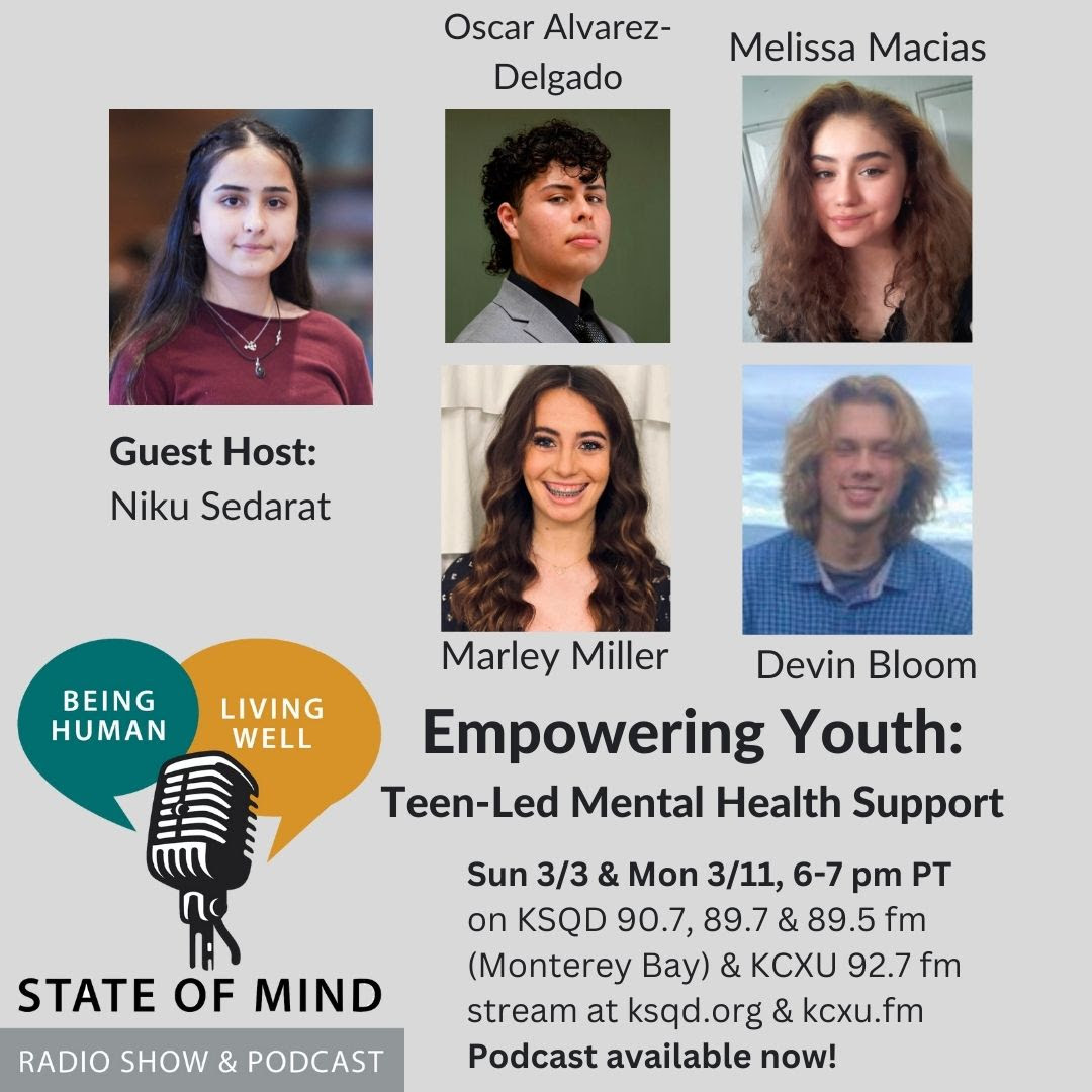 The State of Mind Radio Show & Podcast introduces local teen guests Marley Miller, Melissa Macias, Oscar Alvarez-Delgado, and Devin Bloom, as they courageously share their personal journeys and innovative approaches to promoting mental well-being among their peers.
